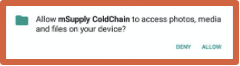 Allowthe application to access photos, media and files on your device: this will allow the export of log data to the device for report and email purposes.
