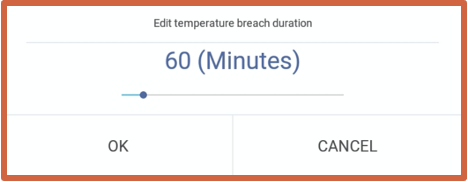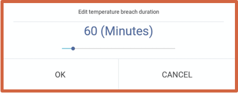 Duration: Using the slider, you can determine how long the temperature must continuously remain outside of the required temperature range for it to be considered a breach. You can set the duration to any length between 1 and 600 minutes.