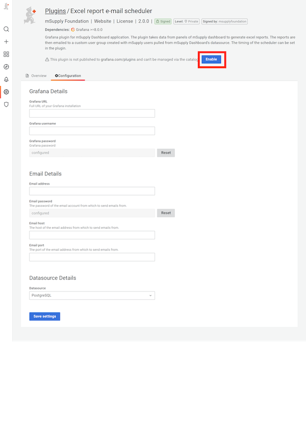 Generate Excel reports from mSupply dashboard. Send the reports to custom created user-groups on pre-defined schedule. Supported Grafana version is later v8.0.0