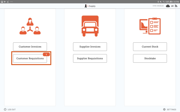 On the home screen, an orange badge on the Customer Requisitions button indicates how many pending Customer Requisitions you have, if any (in this example, there is one pending Customer Requisition).