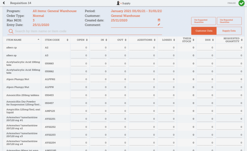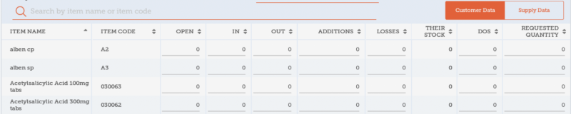 In: quantity received - this will be auto-filled with the quantity supplied since the last customer requisition. However, this cell can also be edited if the quantity received is different.