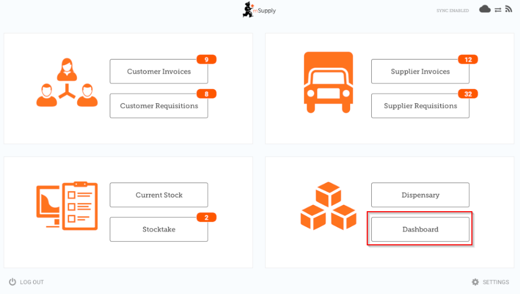 Once it has been enabled you will be able to see the Dashboard icon on the mSupply Mobile Menu page.