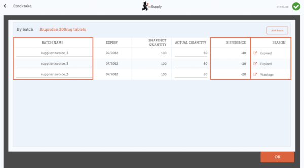 - However, separate reasons for different batches can be manually changed in this screen. In this example we have updated the inventory adjustment of 80 among the batches of ibuprofen, with separate reasons for each batch.