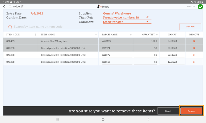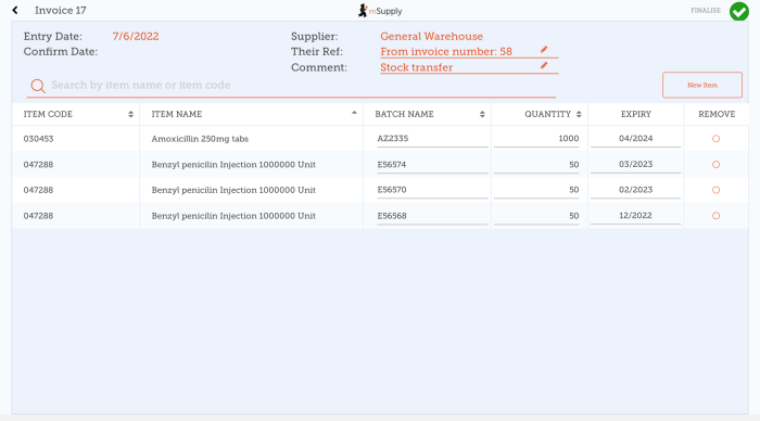 The Supplier Invoice should match the stock you are receiving, but it may not. Just as with paper invoices, it is very important that you check everything against the electronic invoice on mSupply Mobile when you order arrives.