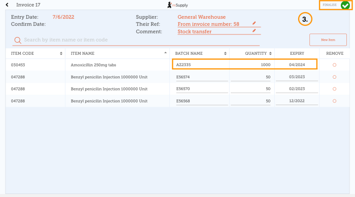 - Add items to the Supplier Invoice and edit the quantities, batch and expiry details