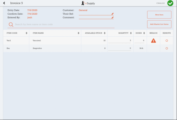 - The Breach column shows when a vaccine item has been in a temperature breach. Note that without entering a quantity into the customer invoice for the item, we don’t know exactly what batches are being issued, so the breach icon may not show up yet.
