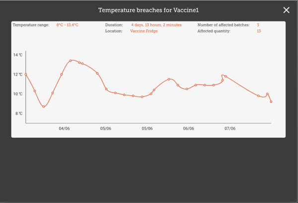 - If the breach icon (an orange triangle with an exclamation) does show for a row, this signals that the stock line has had a temperature breach. Tapping the icon will bring up a graph of the temperature breach. In the example below, the fridge seems to be broken, probably not a good idea to use this batch!