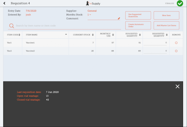 Tapping on a row in your supplier requisition will show you the date of the last requisition for your vaccine, as well as other details such as the open and closed vial wastage since the last requisition.