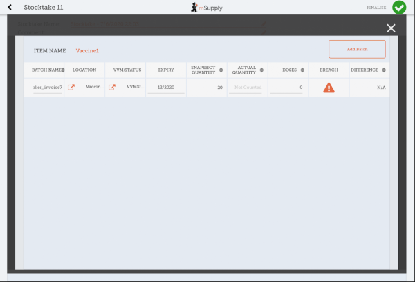 Tapping on a stocktake row for a vaccine item will also show the additional columns for Doses and Breach.