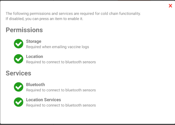 To enable, simply press on the cross icon next to the permission or service. Your device will prompt you to enable the permission or service.
