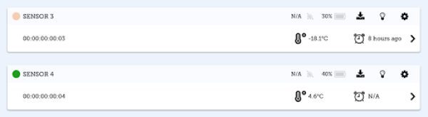 - Circle: a green circle indicates that the sensor is currently within the specified temperature range and the sensor battery is equal or above 25%. A red circle indicates that the sensor is currently outsides the specified temperature range or the sensor battery is below 25%.