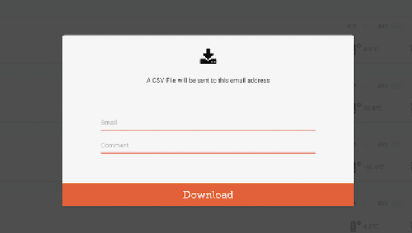 - Down Arrow Icon: Tap to export sensor data (temperature logs and breaches) to csv format and send via email data.