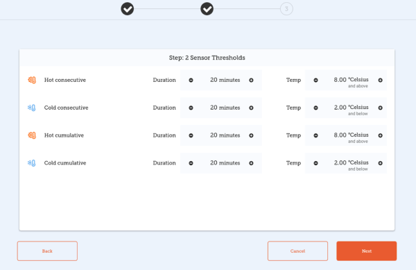 Tap Back if you wish to return to Step 2 and edit the sensor thresholds (temperature breach conditions).