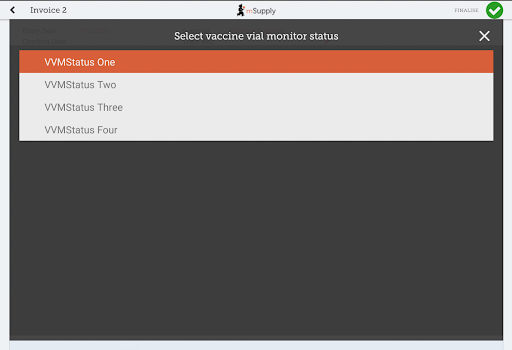 You can also change the Vaccine vial monitor status for items that have been defined as vaccines on the cloud server - this defaults to the lowest level, but can be edited by clicking on the arrow icon in the VVM Status column.