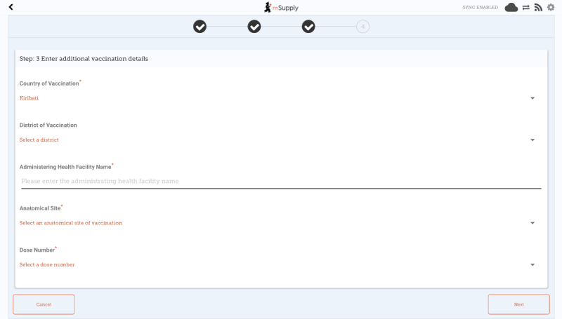 If using v8.0.X, or a form is not configured on the server, there will only be three steps total shown in the vaccine dispensing flow (step three will instead be dispense a vaccine. )