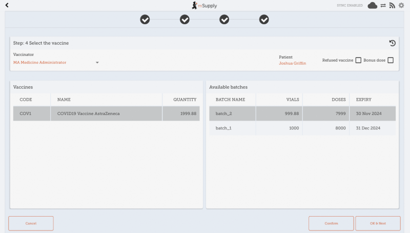 - You can also select which batch the patient received. The batch which is open and with the most recent expiry will be auto-selected for you.