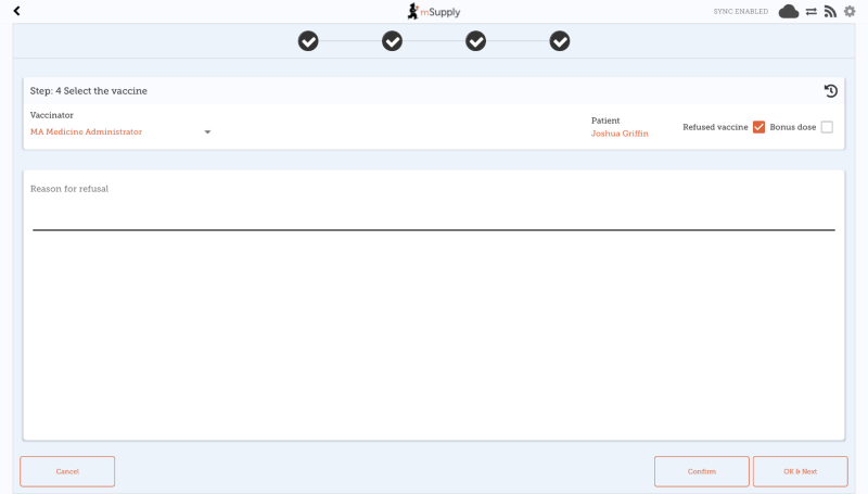 - Tapping OK & Next will allow you to vaccinate another patient.
