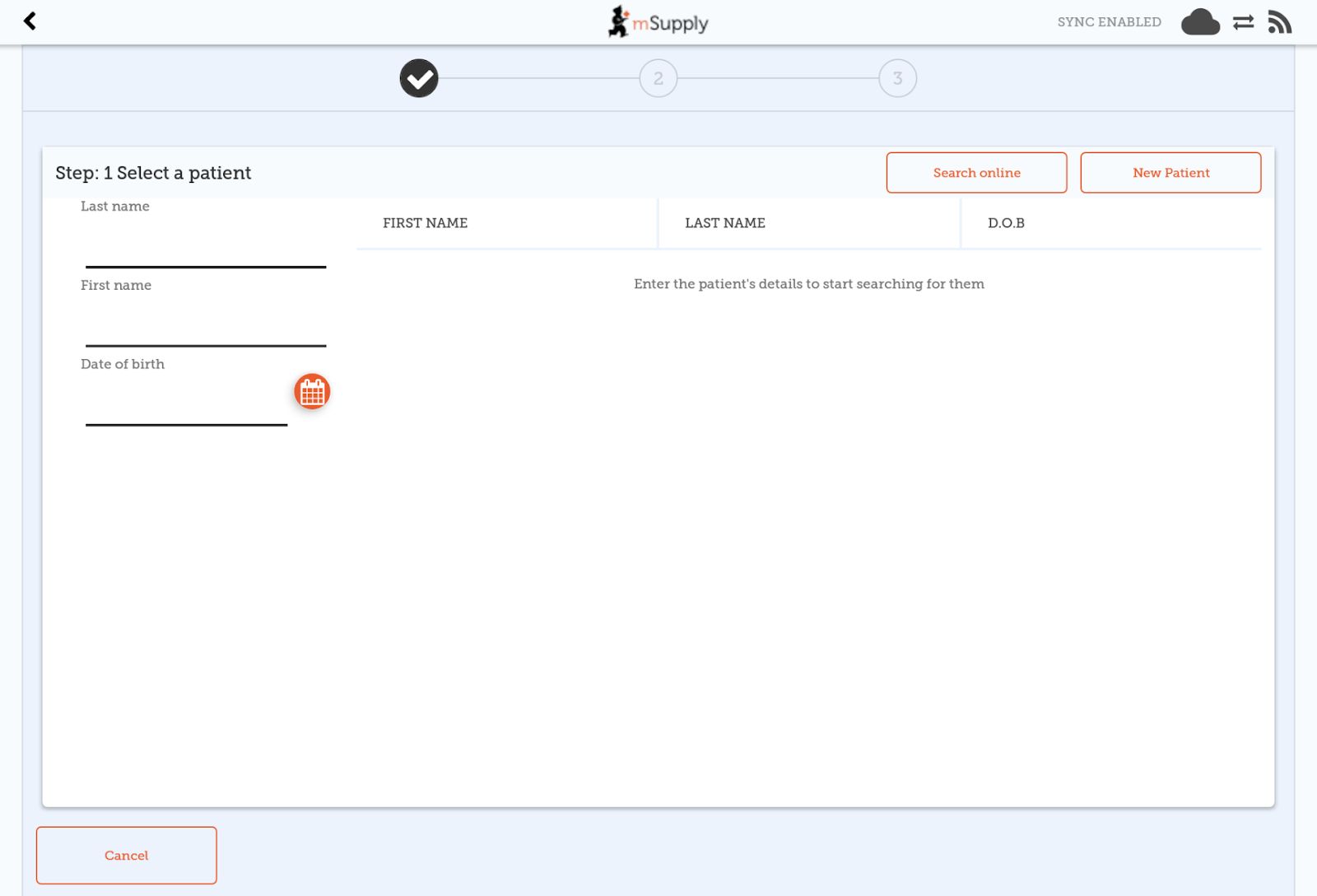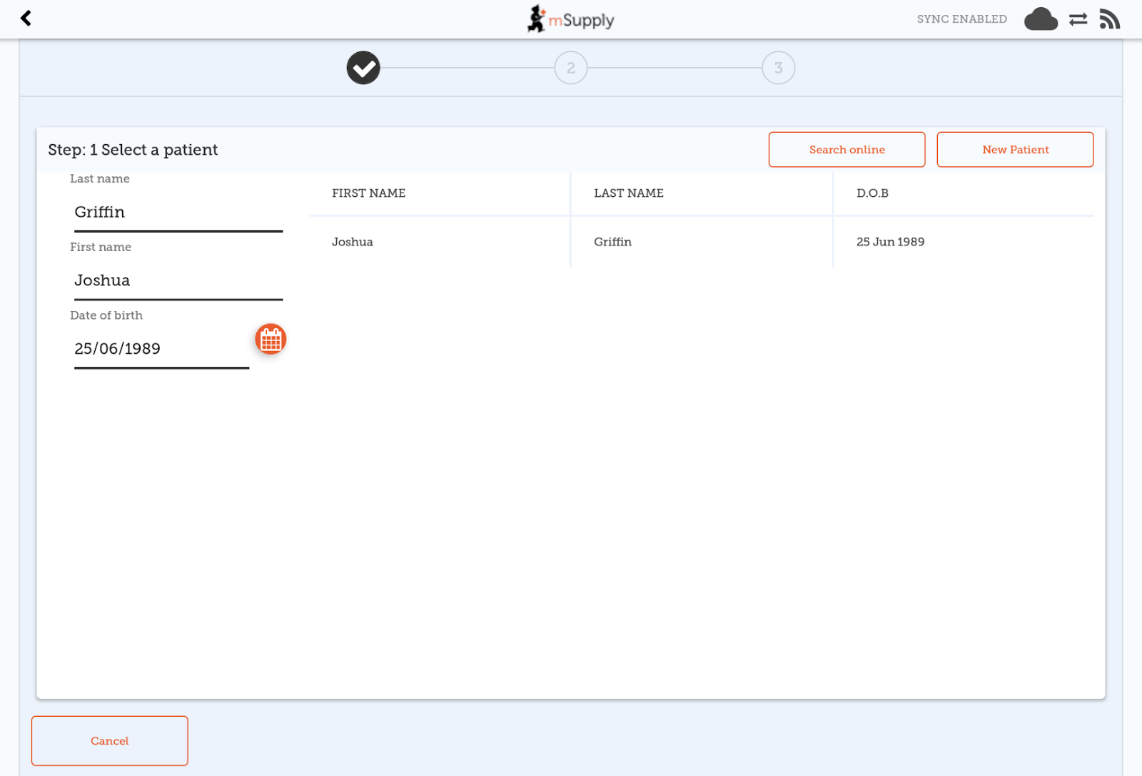 • When typing, we look up in your local database first. If the patient still doesn’t come up, click the Search online button, which will use the same search information you have already entered and send a request to your cloud server to see if the patient exists anywhere in your system.