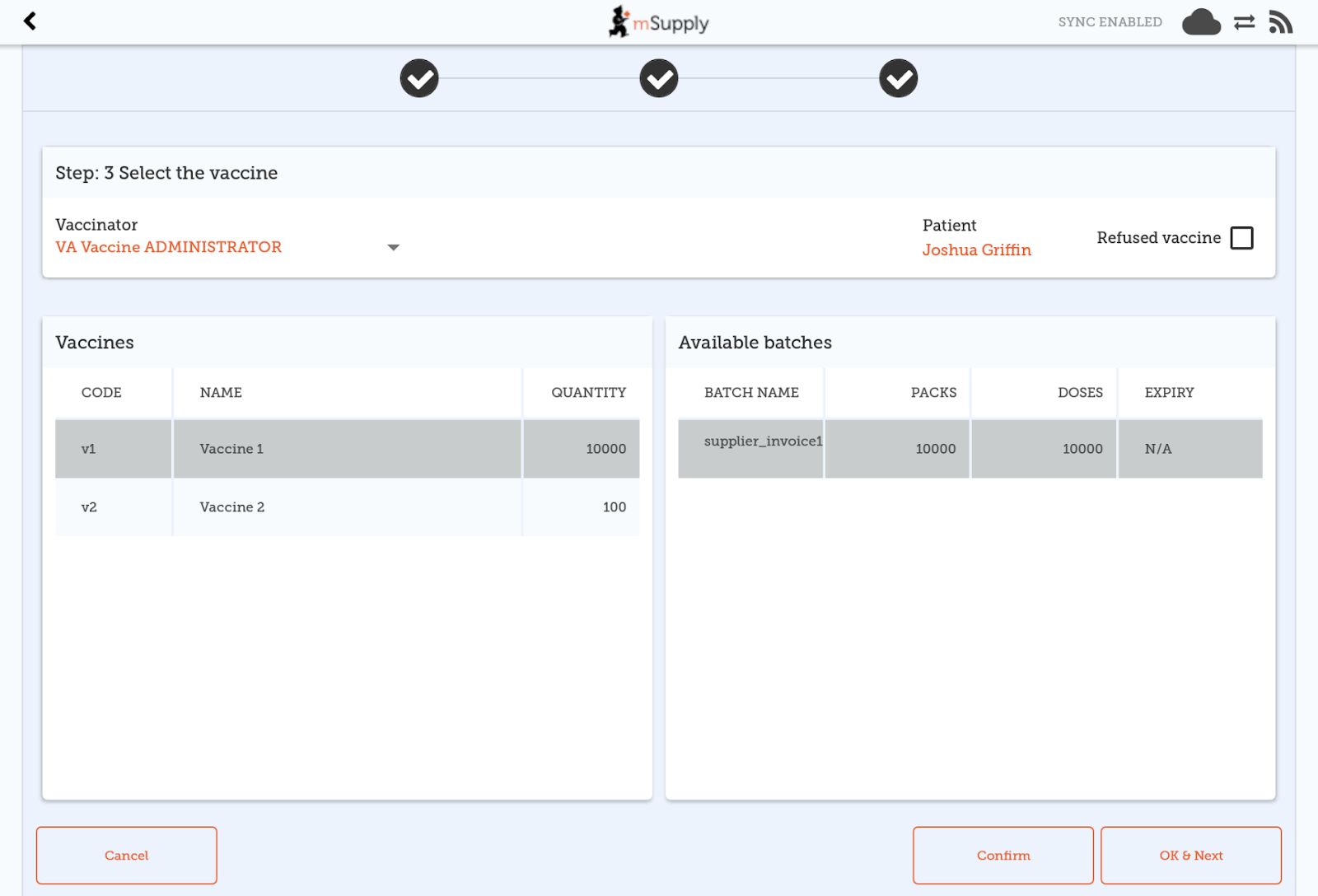 Here you can select who the vaccinator is - these will be set up on your primary server You can also select which vaccine you are giving to the patient. The one which was dispensed most recently will be auto-selected for you. You can also select which batch the patient received. The batch which is open and with the most recent expiry will be auto-selected for you. Alternatively, you can select REFUSE VACCINE which will note that the patient refused to be vaccinated Clicking CONFIRM will send you back to the menu page. Clicking OK & Next will allow you to vaccinate another patient.