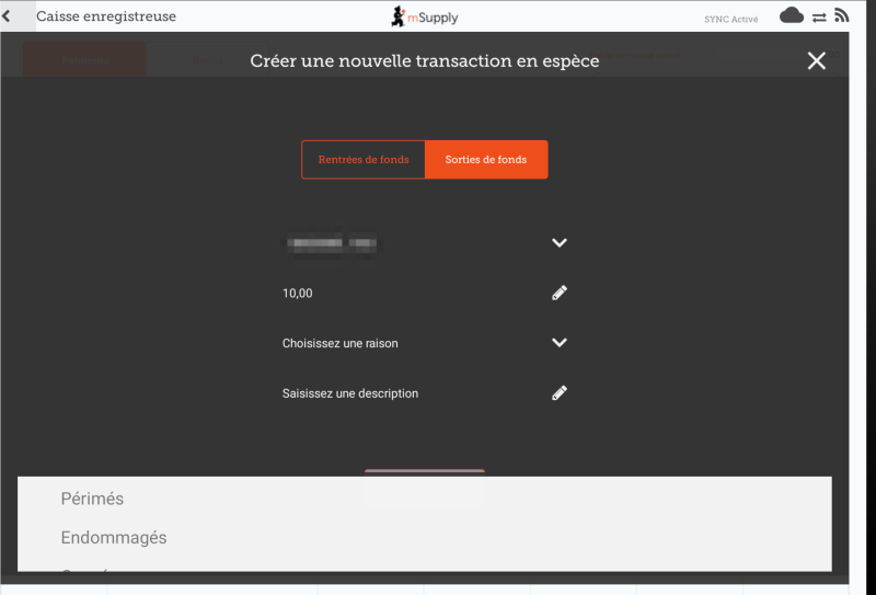 Créer une transaction SORTIE DE FONDS suit le même processus, sauf que devez fournir un motif pour la transaction. Appuyez sur le bouton Choisir une raison, et sélectionnez une raison de la liste.