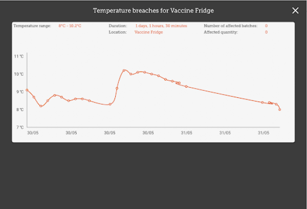 - Si l'icône de rupture (un triangle orange avec un point d'exclamation) est affiché pour une ligne, ceci vous signale que le stock de cette ligne a eu une rupture de température. Taper sur l'icône affichera un graphique de la rupture de température. Dans l'exemple ci-dessous, le réfrigérateur semble être brisé, et ce n'est donc probablement pas une bonne idée d'utiliser ce lot!