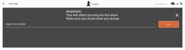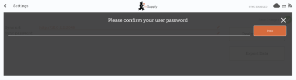 Cliquer sur ce bouton ouvre la fenêtre Paramètres. Cette fenêtre vous permet de modifier l' URL de Synchro et Mot de passe Synchro pour votre dépôt mobile, afficher l'Explorateur Realm et Exportation des données (i.e. exporter votre fichier de données).