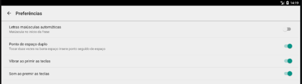 Para facilitar o uso do teclado no Tablet é uma boa idea evitar o uso de letras maiúsculas ao desligar a opção de 'Primeira letra maiúscula' (capitalise first letter) nas configurações de teclado no seu dispositivo: