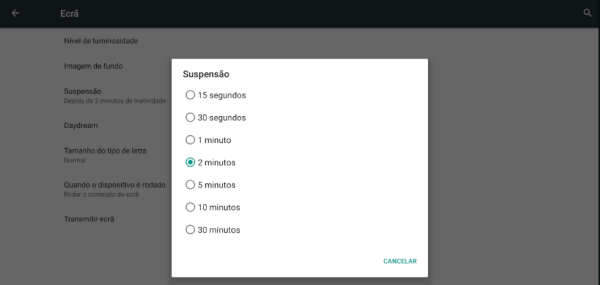 - O tempo padrão para o Modo de espera, que seria o intervalo no modo de espera (sem interação do usuário) pode ser muito curto (30 segundos). Para uma operação normal no mSupply esse tempo curto pode ser incomodo. Então vamos aumentá-lo para 2 minutos. Para alterar essa opção: Definições > Ecrã > Suspensão (Settings > Display > Screen timeout).