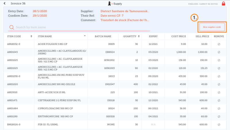 Se houver estoque neste pedido que possa ser retornado, então o botão que normalmente serve para adicionar itens é renomeada para Novo Crédito com fornecedor (New supplier credit) servindo para retornar itens.